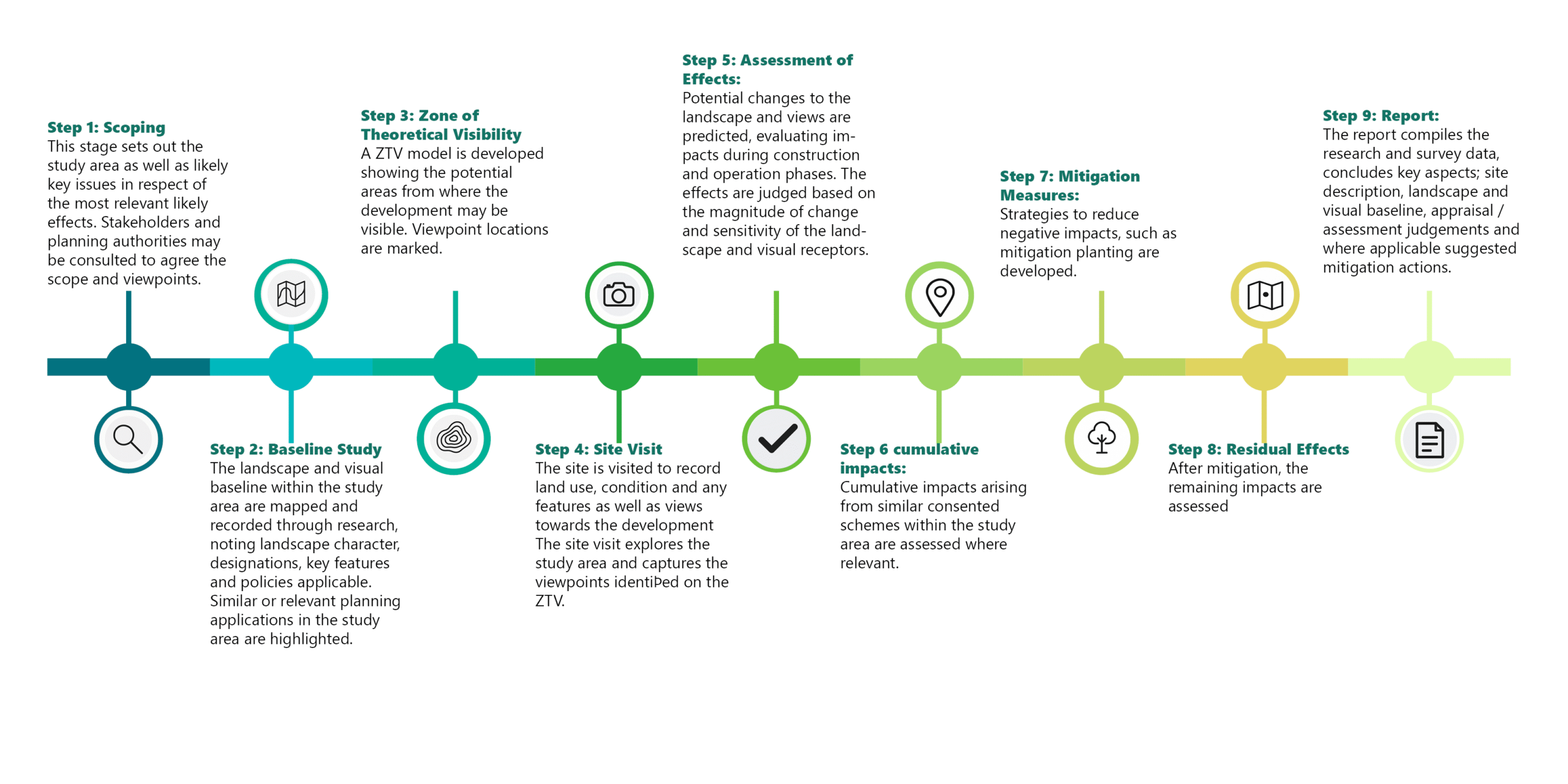 A stand-alone report for smaller or less complex proposals, often undertaken as part of a pre-application proposal or to ensure validation requirements at planning stage. Includes a proportionate baseline study & viewpoint photography, assessment of landscape/townscape and visual effects and mitigation. Prepared in line with GLVIA3.